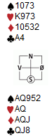 Du har gjort noe så sjeldent som å nedvurdere korta dine i syd, og åpner med 20-21NT. Etter en kjapp staymansekvens er du like etter blitt spillefører i 3NT. Ut fra vest kommer en liten kløver, og hvordan ser du an mulighetene dine? Du spiller IMP, så hovedsaken er å spille kontrakta sikkert hjem.