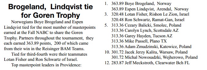 Første halvdel av Kvist Julecup ble gjennomført på torsdag. Drøyt tre poeng skiller de fire beste parene og Bjarne - Olav ble best første kveld, foran Willy - Torstein. Jens og Jan Steinar tok tredjeplassen. Denne kvelden inngikk også i forbundets MP-treff og på landsbasis (353 par) fikk Willy og Torstein en 38. plass, Bjarne og Olav 43. Kvist Julecup avsluttes torsdag 11. desember. Vi var 7 bord første kveld og har god plass til flere par!