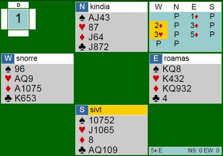 Jeg meldte 3NT i full fart uten å ta meg de nødvendige sekundene. Dette gjør vi alle og som regel blir vi ikke straffet. I slike spill skal vi oftest stoppe i 3NT, men det haster ikke å undersøke. 1ru benekter femkort major (Hauge-systemet). Jeg burde startet med 3ru for å vise hold der, så fortsetter makker med 3sp (hold i spar, men ikke i hjerter). Da kommer vi alle fall i 5kl, kanskje vi finner slemmen også. Det er for dumt å gå to sonebeiter i 3NT når det er 12 toppstikk i kløver.