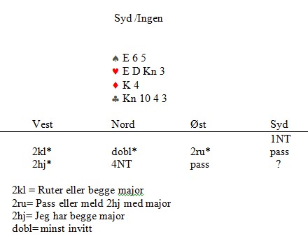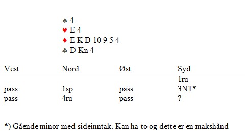 Hadde jeg tenkt meg bitte-litt om, hadde øst vist fire spar, dobbel ruter og fem kløver. Hvis han i tillegg skulle ha hjerterlangde, hadde han enten fordelingen 4-4-5-2 eller 4-3-2-5, henholdsvis femten og fjorten kort. Selvsagt MÅTTE han ha 4-2-2-5 og hjerterdamen dobbel. Det var bare å ta for K10 i hjerter og hente det tiende i ruter. Kun et overstikk i lag, men ikke rart at makker hadde vansker for å holde seg alvorlig.