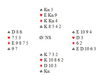 Jeg spiller sparen min, men vest har ikke mer. Øst har altså falsecardet fra E10 igjen, men det er ikke så farlig. Jeg stjeler med hjerter knekt, tar for hjerter ess og stjeler meg hjem med kløver til hjerter åtte. Vest kaster en ruter. Nå er stillingen: