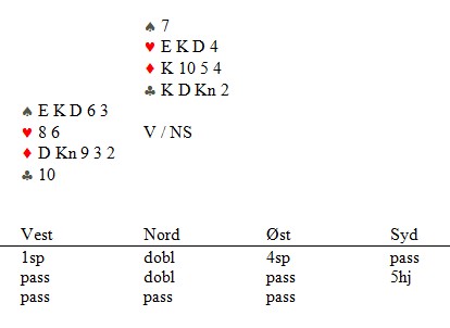 Syd meldte 2hj, selv om makker hadde tenkt svært lenge. Det er opplagt at makker ikke har en normal opplysende dobling, men på den annen side er det ikke så lett å finne ut hva han tenkte på. Mange vil mene at syd har en opplagt melding med en fin femkortfarge der makker normalt har tilpass, i tillegg to dobbeltoner i motpartens farge. I alle fall siden han hadde passet i første melderunde. Andre vil ikke tenke på å melde en gang med bare fire honnørpoeng.