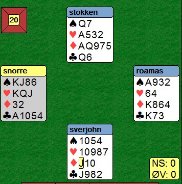 Så jeg har ikke lyst til å si om spilleren får lov til å melde eller ikke, fordi jeg vet ikke hvilket nivå spilleren er på. Sagt på en annen måte, jeg vet ikke hva spillerens likemenn ville meldt på kortene.Om du hadde spurt meg ville jeg sagt at jeg vurderer en pass, men nok melder 2 hjerter. Siden jeg vurderer en pass er dette et logisk alternativ, og du må justere til 2 ruter.