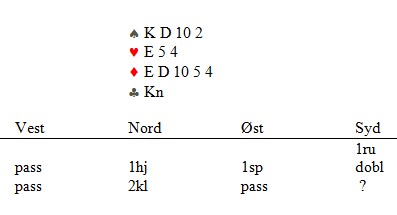 Det handler om XY(Z) og den trer pr. definisjon i kraft når makkerparet har meldt tre ganger på 1-trinnet. "Dobler" er en melding. 2kl ber i eksemplet under meg melde 2ru, men som blant annet GEO skriver i siste BIN kan en ikke slavisk følge makkers oppfordring når en har en vesentlig sterkere hånd enn det som allerede er vist.