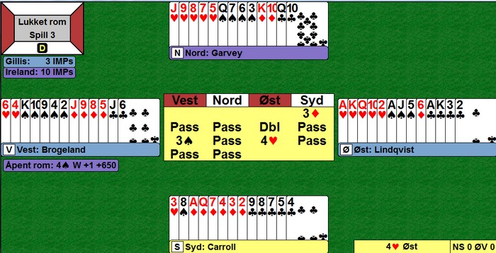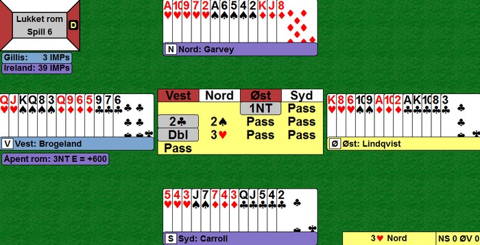 Heldigvis vinner Gillis 23 IMP på de to siste spillene. Det ene etter at irske ØV hadde to sjanser til å beite 3NT, en i utspillet og en i stikk to. Det klarte de ikke, mens Boye hadde et opplagt utspill fra KKn10xx på det andre bordet.