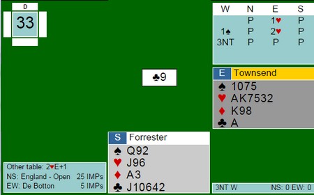 Syds 2 ruter viste begge major. Spar seks kom ut tile esset og mer spar tok jeg med damen, Nord la fireren. Med minimum ti kort i major var jeg interessert i å finne ut minorfordelingen og tok to ganger kløver, Syd hadde singelton. På to ganger kløver til la han hjerter, og kort fortalt spilte jeg på ruter dame dobbel hos Syd og gikk bet da kortene var:
