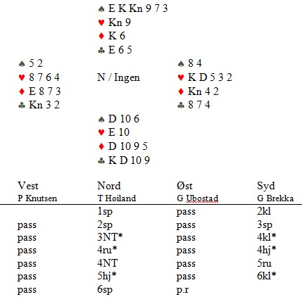 Ikke verdens verste slem å melde. Med hjerter ut står dette og faller på kløveren. Gaute Ubostad kasta tidlig en kløver fra tre små og da ble det easy-peacy for Tom.