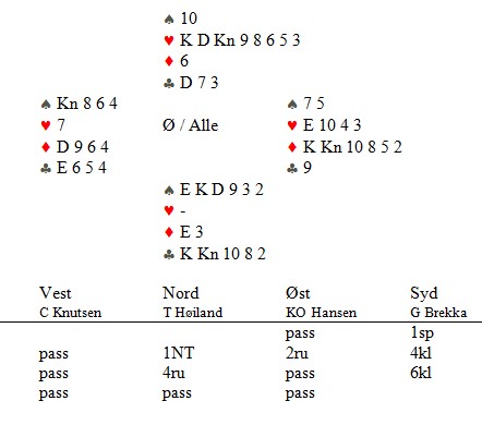 Singel ruter hos makker var kanskje ikke det beste Karl Olav kunne ønske seg, men til tross for at makker gikk ned i 4hj over 3sp, meldte han en gang til. Da hoppa Calle ut. Når ruterkongen satt tredje i kapp, var det ikke mulig å gå beit. Karl Olav stjal to ruter og kongen kom deisende på. Hjerterkongen til motparten, men +1430.