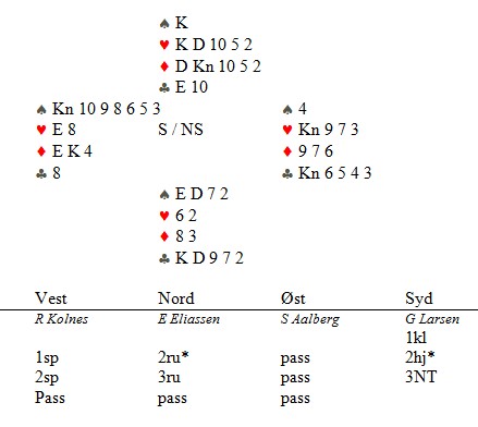 Jeg startet med ruterdamen som "selvsagt" sto. Jeg kunne ikke se enda hvem som hadde dobbel ruter, men jeg visste makker hadde spar esset eller hjerteresset. Skift til spar i tilfelle spillefører måtte gjette den fargen. Knekten vant, men på hjerter fra bordet gikk Ronny Kollnes opp på esset, spilte ruter til mitt ess og ruter til stjeling.