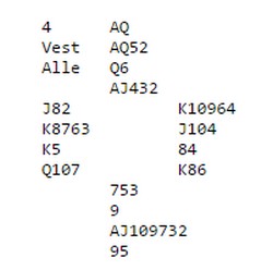 Her var Norge griseheldige som stoppa i 1NT med 27 hp tilsammen. Det ble ni stikk.