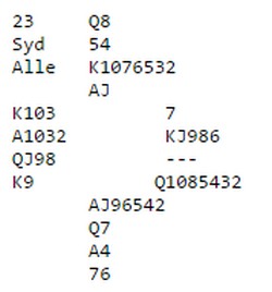Dette stemte, og neste gang Jon skulle melde, var motparten (selvfølgelig) på 4-trinnet. Nå meldte han 4NT, men motparten meldte kjapt på 5-trinnet og to passer til Jon. Reint gjettverk nå. Hva som hadde skjedd over 4NT, er det ingen som vet. Det er heller ikke poenget i dette.