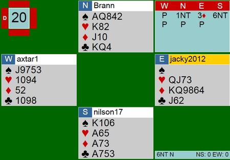 Siden øst han mange ruter, er det naturlig å spille på sparlengden i vest. Derfor spar til kongen og sitsen oppdages. Spar ti blir dekket og bordet vinner. Fire ganger kløver (litt heldig) og stillingen er denne etter å tatt ruteresset. (viktig)