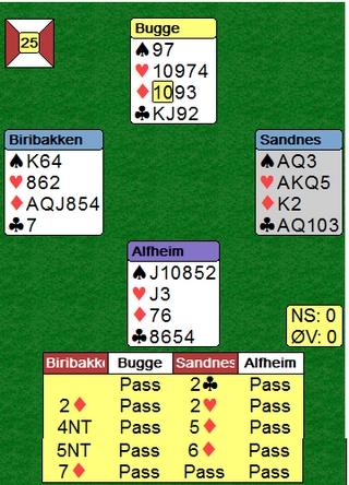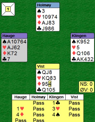 Spar til esset og spar til kongen, ingen kapp fordi en kan ikke spille mer enn to runde spar likevel. Ruter kongen, kløver ess og kløver til stjeling. Vest stjeler sikkert over, men syd får enda fint stjålet en kløver og kastet hjertertaperen på ruteresset. Bordet tar de to siste med en trumf og den trettende kløveren.