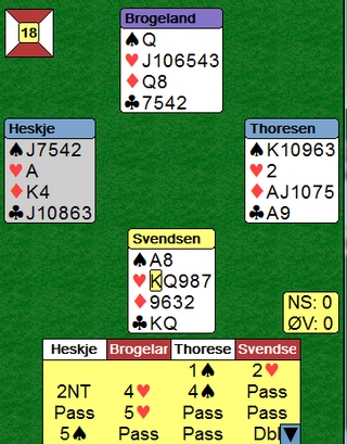 er en god regel. Det blir ikke alltid rett, men jeg tror det er vinnende i det lange løp. I alle fall i dette spillet og Torild Heskje kunne se makker notere +650. 5hj koster 500, men for vest kunne dette vært et spill hvor det stor utgang begge veier, til og med på 5-trinnet.