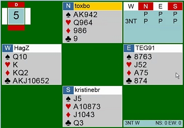 Tonje Brogeland spilte med reserve Kristine Breivik på lag med Gunn Tove Vist og Stine Holmøy. De møtte juniorlaget med Kristoffer Hegge - Tor Eivind Grude og Harald Eide - Espen Flått. Her vant juniorene med 19 IMP, ikke minst takket være denne åpningsmeldingen av unge Hegge.