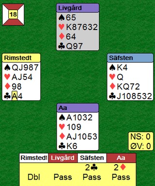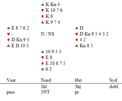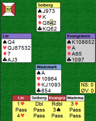 Jeg skjønner ikke helt hvorfor Terje Lie ikke dobler 2sp "på veien" til 4hj. Har makker en stor fordelingshånd, kan de alltids komme dit. Det ser ut som det er bare tre stikk i 2sp og 1100, men jeg tror han må få to sparstikk for "bare" 800 fordi ØV må spille spar for å hindre hjerterstjelilga i bordet. Da tror jeg syd må få for både damen og knekten etter hvert.