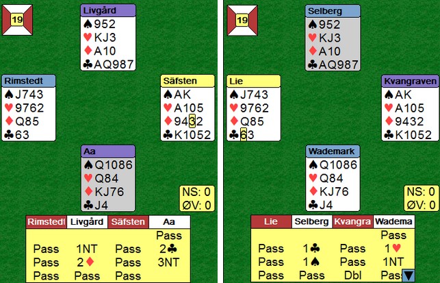 Han valgte å oppvurdere denne fine 14-poengeren til 15-17 og kom med det i utgang. Jeg vet ikke om den kan beites med åpne kort, men ruter ut til damen gjorde spillet ikke så vanskelig. Spar i stikk to og da var det 1-2-4-2 = 9 stikk. Jeg vet ikke hva du synes om Nils sin gjenåpning i ugunstig sone. Terje gjorde nok det beste ut av situasjonen ved å passe og etter et ikke helt topp motspill ble det hele ti stikk og + 480 ut for minus 2 IMP. En blå lapp av syd og helvete hadde vært laus. Litt mye parturnering, unge Kvangraven? 17-5 til Sverige