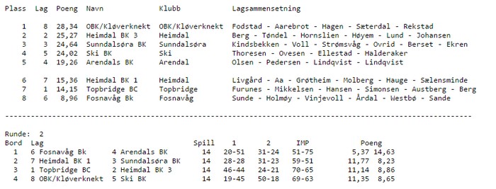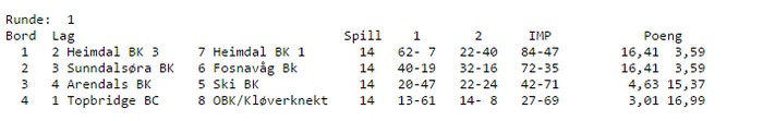 Min favoritt i år er Sunndalsøra og de startet godt mot arrangøren. Ski BK tar også medalje (tror jeg). 15,37 er en fin start. Toppbridge vet jeg mange tipper høyt oppe. Beklager gutter, men jeg tror ikke det holder til podiet i år. Et stort tap i første kamp mot OBK/Kløverknekt. Skal vi tro på en overaskelse derfra?