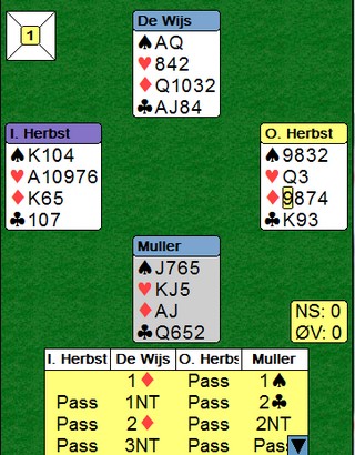 Jeg registrerer at Allan Livgård passer i øst, mens Aksel Hornslien åpner med 3hj. Hva er galt med å starte med 1hj? Det "mangler" noen honnørpoeng, men både antall stikk og antall taperer forsvarer fint åpning på 1-trinnet. Noen er kanskje redd for at makker skal melde utgang hvis han også har åpning, men er ikke det fint da? En skal være uheldig hvis en 12-13 poenger i vest ikke gir spill for 10 stikk i hjerter. Skulle makker gå på mot slem, er det godt mulig at esset syvende og et ess er mer enn nok til å vinne både 12 og tretter stikk. Jeg er jo snart en gammel mann, men jeg kan da ikke ha blitt friskere enn ungdommen?