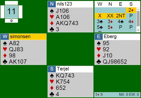 Jeg griner. Hvorfor kan dere ikke melde de fargene dere har? En og en. Nedenfra og opp. Hvis dere finner tilpass, støtter dere hverandre. Ja, jeg vet det er umoderne og bakstreversk, men det virker. Å komme til storeslem i minor er kanskje mye å forvente, men 6kl/6ru må da være mulig for topparene våre?