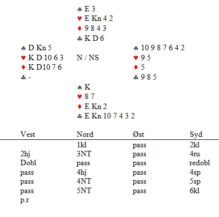 Det er en god sjanse for å ende opp i 6kl nå også. Det er veldig mange ender opp i 3NT, rett og slett fordi det er vanskelig å vise hendene når en starter på 1trinnet å melde.