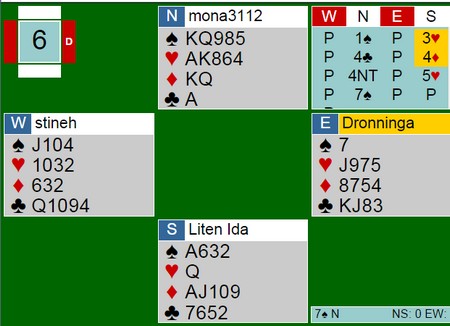 Så en flott storeslem av Berg - Simonsen. 4kl viser renons og EK der var kanskje ikke det beste, men det er jo aldri noen ulempe med esser og konger, så fremt hånda ellers også er sterk. Erik stjal to to små kløverne i bordet og kasta to spar på EK i ruter. 13 stikk.