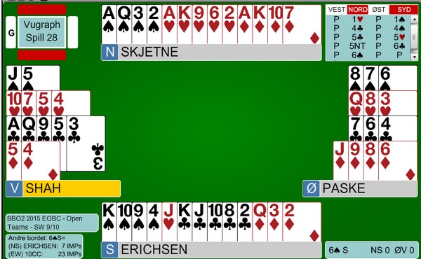 Noen ganger sperrer du motparten bort fra en slem som går beit. Det skjedde i dette spillet. ØV hadde ikke noe annet valg enn å doble 5ru, mens på det andre bordet fikk de melde mer i fred og kom til 6sp.