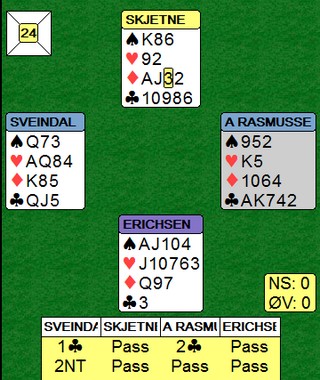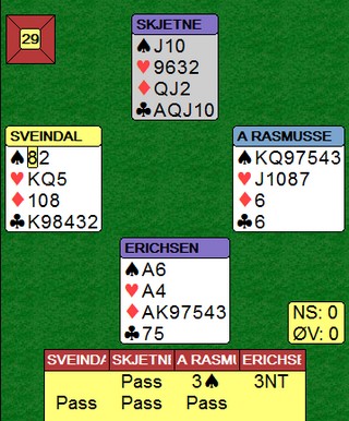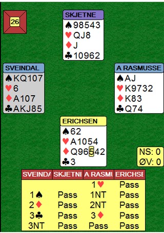 Jeg er aldri noen tilhenger av å melde NT uten hold i motpartens farge, men alternativene var verre for Sverre Johnsen. Spar ut til damen, hjerter til knekten og mer spar til esset. Nå bomma øst ruter med en liten til damen og en ny til nieren. Fire spar stikk, fire hjerterstikk og EKn i ruter ga fire sonebeiter. På den andre hånda kommer sparkongen ut og da er en MYE lengre. Treffer en minorfargene, kan det vinnes åtte stikk.
