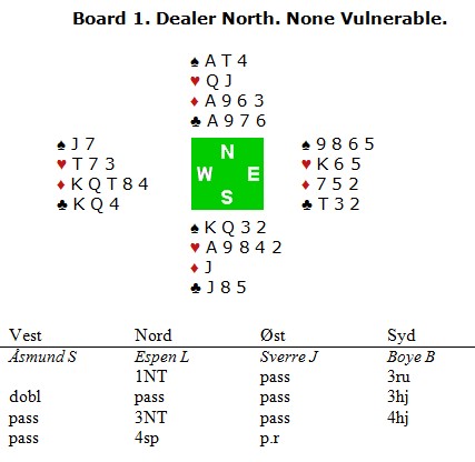 Spar esset og skift til kløver. Hjerter til esset og ruter. Du må stikke med esset og spille mer trumf. Jeg vet ikke om det er rett hver dag hele året, men i alle fall denne gangen når Åsmund Stokkeland kappa på nieren og stjal en ruter hjem. Alt NS fikk var ruter ess og sparesset. Et stor tapsspill siden Mahaffey var i 3kl på det andre bordet.