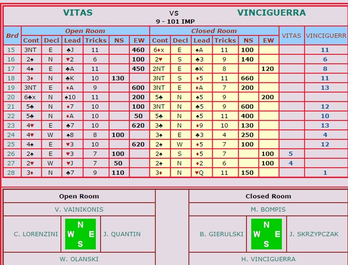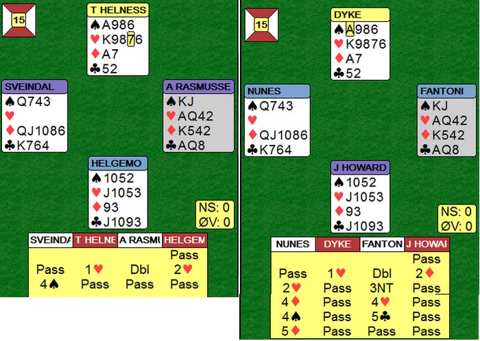 I spill 1 kom Jon og Arild i 4sp på 4-2. Det har neppe skjedd siden Koreakrigen, i alle fall Vietnamkrigen. Noen spill seinere bommer de på NT-intervallene og havner i 3NT med 12 mot 9 hp. Tor dobler, men Geir oppfatter det som spar ut (bordet "meldte" farge). Så finner Arild ruteren ved å kappe på nieren og får fem stikk der. I sluttspillet forsvinner enda et stikk og Noralia berger med en beit (!) for -200. Likevel en syver ut med 2sp N 6 stikk på det andre bordet.