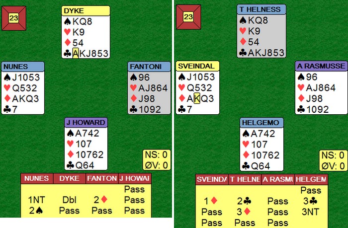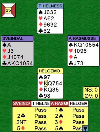 Tor og Geir kommer i en steinhard 3NT, men hadde vest hatt hjerteresset måtte Noralia klart å cashe fire ruterstikk. Nå ble det fire sonebeiter til tross for at EKD i ruter felte knekten. Jon Sveindal fant hjerterskiftet i stikk fire!!