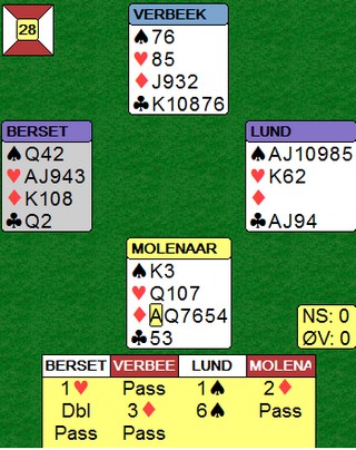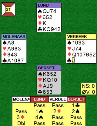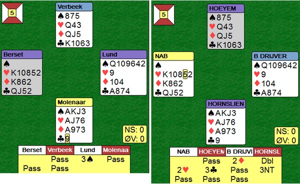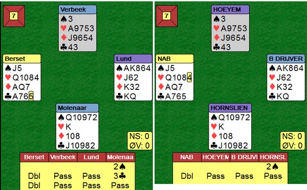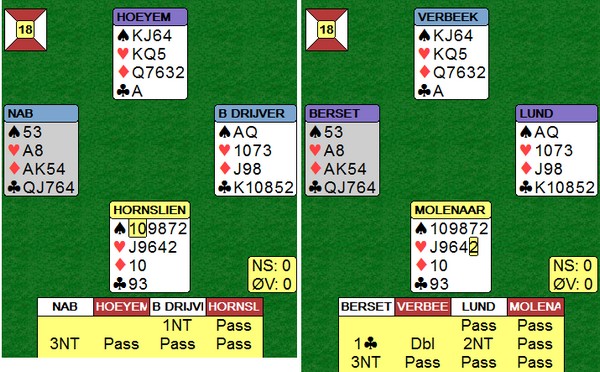 På det andre bordet spiller nederlenderen ikke så bra. Han stikker kløveren og fortsetter med spar ess og spar til stjeling. Så kløver mot bordet, men Børre bare stikker og spiller trumf til bordets ess. Kløverknekten kan Ole i syd stjele og de ti stikkene har blitt til ni.