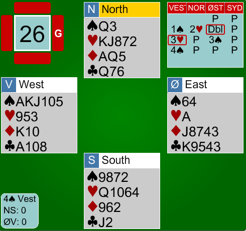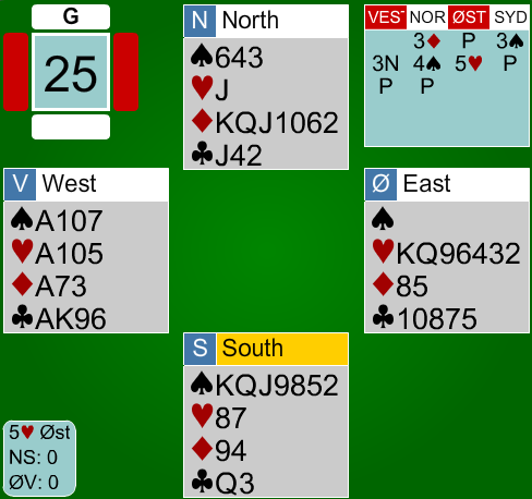 Ole tenker omtrent slik, tipper jeg. "Makker har KDxxxx i hjerter og en honnør til. Er det kløverkongen, står 6hj hvis kortene sitter sånn nogen lunde. Makker kan også mangle kløverkontroll, men hvis jeg cuebidder 4ru vil det fortelle motparten at de skal spille ut kløver. Jeg kan spørre etter ess, men selv om jeg får KD i hjerter og kløveresset, trenger det ikke stå 7hj. Makker kan ha singel spar og da må den fargen fort sitte 3-3. Det er for dårlilg odds. Det er ikke veldig sannsynlig, men makker kan ha singel kløver."