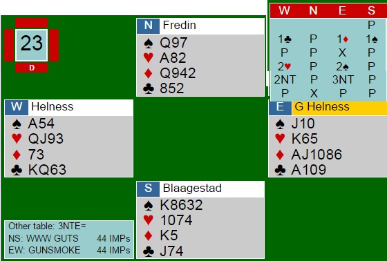 I parturneringer kan mye skje, men det er tross alt 150 spill som ligger til grunn for de resultatene som nå bestemmer hvem som skal være med videre og ikke. Jeg hører stadig par som klager over uflaksen de har, men jeg tenker at når noen par har uflaks, må andre ha flaks. For å si det på den måten så hører jeg lagt mindre fra den siste gruppa. Min påstand er at bridgen egentlig er ganske rettferdig over tid og de enkelte par får de resultater de fortjener. I dag var de 100 par som kjempet om 46 plasser og da er det 54 som ikke klarer det. Sånn er det bare.