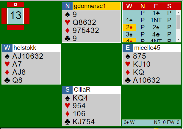 Motparten meldte ikke. Idet vest krevde til utgang (XY) etter østs gjenmelding 1 grand (1K-1S, 1NT) viste øst sparstøtte. Nå meldte vest 3 spar som en (liten) sleminvitt. De endte i 6 spar.