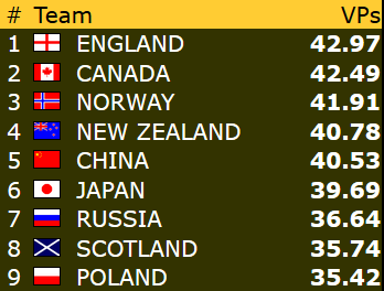 I morgen avsluttes Round Robin med de to siste rundene. Like før klokka 10 i morgen formiddag vet vi med sikkerhet hvike lag som går videre til sluttspill. Det ser unektelig bra ut for Norge både i åpen klasse og dameklassen. Men jobben må fullføres i morgen for å sikre plass i kvartfinalene. Det kan også være et poeng å komme så høyt som mulig for å unngå den verste motstanden i kvartfinalene. Systemet er nemlig slik at nummer 1 får velge blant lagene på plassene 5-8, deretter får nummer 2 velge blant lagene fra 5-8 som gjenstår og så videre.