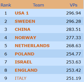 Norge meldte ikke slemmen hverken i åpen klasse eller dameklassen, men begge lagene vant likevel 8 IMP for å spille 5 ruter da det ble spilt 3 spar udoblet med tre sonebeit nord-syd.