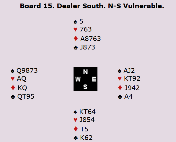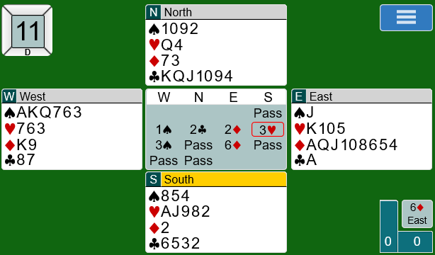 I spill 11 kom enda et slemspill (jeg må innrømme at jeg har følelsen av at de kommer hyppigere enn vanlig i dette mesterskapet). Engelskmennene Jagger (øst) og Allerton meldte seg opp i 6 ruter på denne måten: