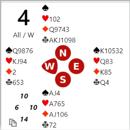 LUNDBERG sitt N/S-par spilte 5 kløver. Det er ikke så lett å melde disse kortene for N/S, for de får ikke melde i fred. Etter åpning av nord (1 kløver er korrekt) melder nok øst inn 1 spar. Syd dobler for å vise hjerter, og nå hoppstøtter de fleste med vest sine kort. Helgemo (øst) sa 1S, og ZIA (øst) 4S. Da kom Hoftaniska (nord) tilbake med 4NT som i en slik situasjon bør vise ruter ved siden av lang kløver. Charlsen (syd) mente slem var sannsynlig nå og sa 5 spar. Men da Hoftaniska sa 6 kløver passet han. Kommentatorene på BBO stusset på hvorfor han ikke sa 6 ruter. Kanskje han trodde nord hadde 4-7, eller gående kløver slik at kløverkontrakt var tryggere. Vel, som sagt er 6 kløver bra, den avhenger av enten null kløvertaper, eller ruterfinesse. Det er naturlig å ta kløverfinesse. Da blir det en taper i den fargen, men ruter konge sitter i saks så 6 kløver står.