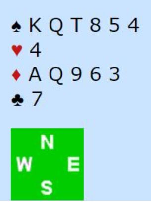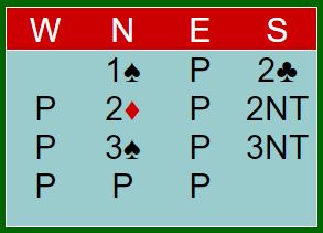 Den norske nord meldte 3 spar - sekskorts farge. Da sa syd 3NT, Nord kunne ikke vite sikkert om han skullle ta ut. Han passet og de skulle spille 3NT etter dette meldingsforløpet: