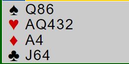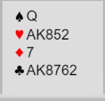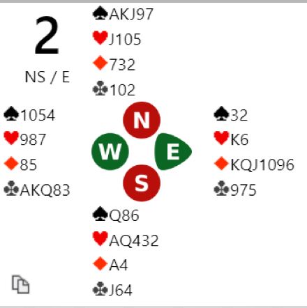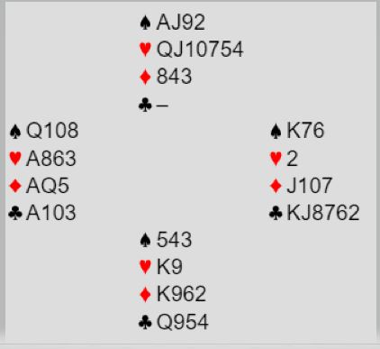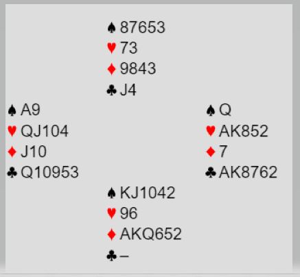 Merk at dette er en sånn spørresituasjon hvor 4NT som spørsmål er litt høyt. Over 5 ruter-svar på 4NT (og hjerter er trumf) blir det ikke plass til å spørre om trumf dame. Så her måtte Sunde gjette. Han valgte altså å si 6 hjerter! Det kan jo være at vest har femkorts trumf også, og da går det som regel bra selv om hun ikke har trumf dame. Men har hun fire små hjerter må det sitte 2-2, og er det kun trekorts trumf hos vest kan det være for hardt med slem.