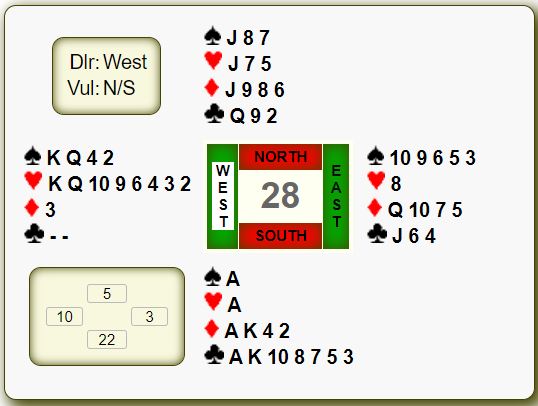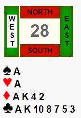 Det eneste som nå kan true denne slemmen er at det blir to rutertapere. Ofte er det den som sperremeldte som er kort i en slik farge, men husk her har vest allerede vist renons i kløver. Han kan ha noe sånt som 1-8-4-0 fordeling, men det kan like gjerne være 4-8-1-0. Selvsagt kan det være andre fordelinger, også med kun syvkorts hjerterfarge siden hans sperremelding var i gunstig sone.