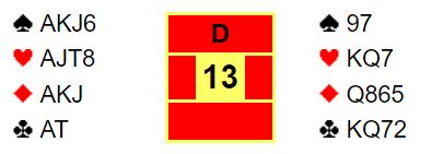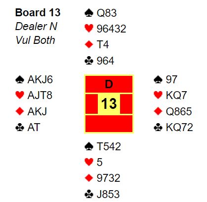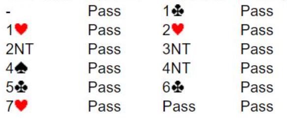 Vest så nok for seg at det kunne være en liten dobbelton spar eller en liten dobbelton ruter på den andre siden, så det kunne være det trettende stikket ville komme ved å stjele et kort på den siden med tre trumf (ekstra trumfstikk). Og vest vet at trumfen er brillefin, A-J-10-8 mot K-Q-x. Så det kan om nødvendig trumfes høyt og senere kan trumfen tas ut med fire store trumf i fire runder om nødvendig. Godt fornøyd med alt dette avsluttet vest med 7 hjerter. Slik så altså hele meldingsforløpet ut: