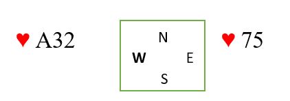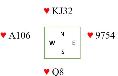 Det kommer en liten hjerter ut fra nord mot din grandkontrakt. Det er jo svært ofte sånn at du må innom motparten for å godspille egne stikk du kan ta for idet du kommer inn igjen. Hvis hjerteren i dette tilfellet sitter 4-4 spiller det ingen rolle hva du gjør i starten, de vil få tre hjerterstikk i det de kommer inn igjen, og de får totalt tre hjerterstikk om du lasjerer også. Men om hjerteren sitter 5-3 kan det være du tjener på å lasjere (ligge unna) to ganger, og så stikke tredje gang. Stikkes med esset første eller andre gang kan han med trekorts hjerter spille inn makkeren i fargen hvis det er han med trekorts hjerter som kommer inn idet du må slippe dem inn. Hvis du lasjerer to ganger, og han med trekorts hjerter kommer inn (for eksempel på ett ess) er det ikke sikkert den motspilleren med femkorts hjerter har noe inntak, og han/hun blir sittende å se på hjerterstikkene sine resten av spillet!