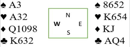 Vest har åpnet med 1 minor, nord har meldt inn 1 spar, og øst doblet negativt (hjerter). Idet vest kom tilbake med 1NT sa øst 3NT.