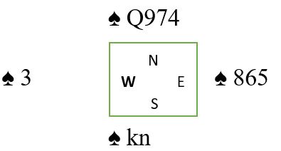 Det kommer altså spar 10 i utspill til kongen fra syd. Lasjerer du nå går det galt, en bet ganske raskt. Syd fortsetter med spar knekt til esset. Nord kommer inn og får tatt sparstikkene.