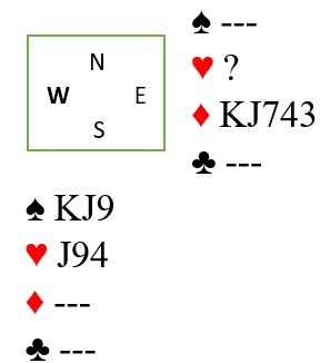 Om vest hadde hatt kun trekorts kløver kunne vi fått til et innspill mot han etter en haug med trumf, ved å spille spar ess og så knekten eller nieren. Hvis han da hadde hatt kun spar og ruter igjen måtte han ha hjulpet deg. Men vi vet han startet med femkorts kløver, og han kommer til å holde en kløver og fri seg med det kortet, og da taper du to sparstikk.