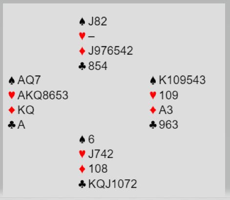 gikk som med kjepper i hjul med Jan P. Som makker i Øst. Frønningen fikk liten hjerter ut og så direkte at hvis kløverfargen brekker kan det være skvis med ru sammen med sp D eller hvis sparen sitter med sp D dobbel. Å spille på at sp D10 er sammen med ru K er også en mulighet. Menn da spmA der 9-er kom fra Nord var det bare å håpe! Sp K felte deretter sp D i Nord og 13 stikk var hjemme.
