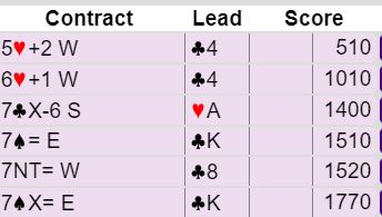 Gode fordelinger med solid trumftilpasning gjorde at begge sider presset på ut over det poengstyrke skulle tilsimen sonene var jo gunstige. Ru D kom ut fra Jens Henrik og da den beholt stikker spilte han kl 5 i 2. stikk og den måtte jeg jo bare stikke med knekten som fikk beholde stikket. Sp 5 til knekten stakk Vest og spilte ru 3 til kongen fra Per Even, men jeg kunne stjele, ta for sp J der Vest sakte ruter og på sp 3 til damen ble nok en ruter saket fra Vest. Hvordan spille videre, er det hjerter- eller kløver- fargen man kan håpe på jevn sits i?. Begge fargene kan jo sitte 3-3 imot. Valgte begge, trumf hjem og kløver til damen fulgt av kl A men da viste Øst utsolgt og sakte ruter. OK, vi kjører bare på med hj A, så hj 7 til liten og knekten som fikk beholde stikker. På hj K fulgte både Øst med kongen og Vest med 10-eren. Dermed var de to små hjerterne godspilte bare ved ta dem og 11 stikk var vunnet for ren topp. Og det holt til 2 poeng seier forran Astrid og Hans. De var ikke like heldige på slutten.