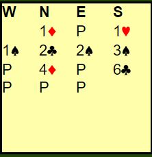 Dette er på ingen måte et spill hvor det kan eller bør meldes storeslem selv om den er nedlegg! Lilleslem er som regel mer enn godt nok med 26 HP til sammen og denne typen kort. Og det var nok i denne kampen, for Bogø-Sivertsvik var det eneste paret som fant frem til lilleslem! Ett par var sogar i delkontrakt, men det var nok etter en kjempeblunder av nord som passet på 4 kløver etter at syd tidligere hadde brukt fjerde farge krav. Resultatene ved de seks bordene var slik: